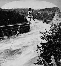 Signorina Maria Spelterini crossing the Niagara Rapids on a tightrope.